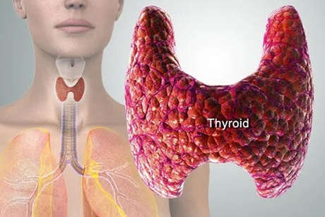 The thyroid is a butterfly-shaped gland that sits low on the front of the neck. Your thyroid lies below your Adam's apple, along the front of the windpipe. The thyroid has two side lobes, connected by a bridge (isthmus) in the middle. When the thyroid is its normal size, you can't feel it