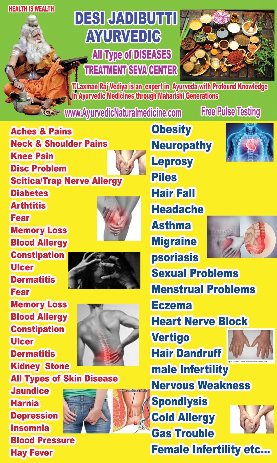 We are Been Practicising Ayurvedic Since Ancestors Time.All Types of Diseases can be cured with our Hand made Medicines. Those who practice Ayurveda believe every person is made of five basic elements found in the universe: space, air, fire, water, and earth. Your practitioner will aim to restore or maintain your health and well-being. They will do it by balancing many factors in your life. To plan your treatment, they will take your medical history and assess your doshas. They will examine your tongue, lips and nails, and look inside your eyes, ears, nostrils and mouth. They might also examine your back passage (rectum) and genital area. They will listen to your lungs and heart and take your pulse. Mainly Our Specialists Examine Your Pulse and Rectifies Your Problem.